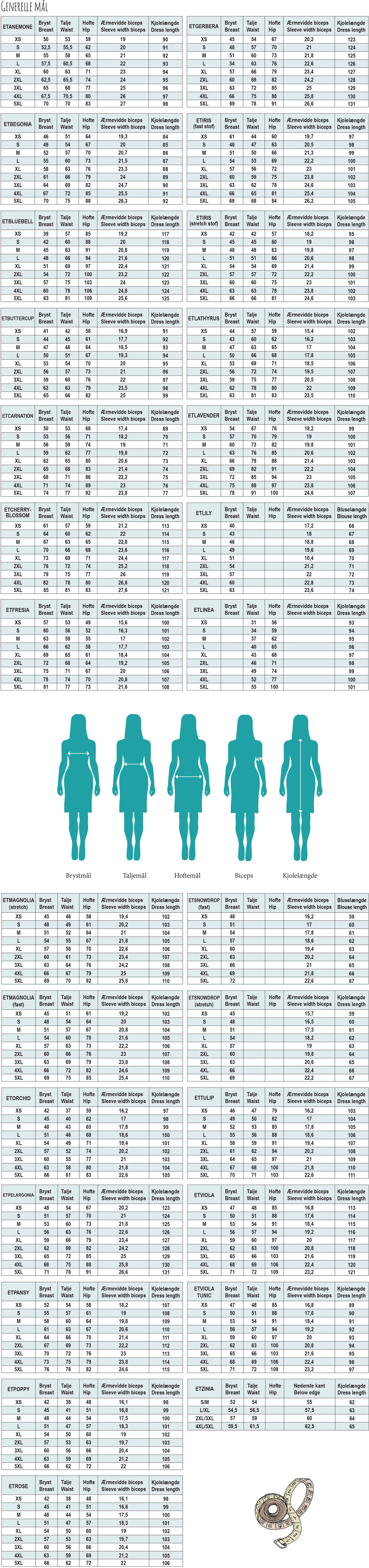 Målene i skemaet forneden - er de mål, som de færdigsyede kjoler/styles har. Du skal være opmærkom på, at vores mål er halve mål (pånær kjolernes længde). Derfor skal de ganges med 2 - når du sammenligner målet med f.eks. dit mål rundt om hele brystet/ryggen.